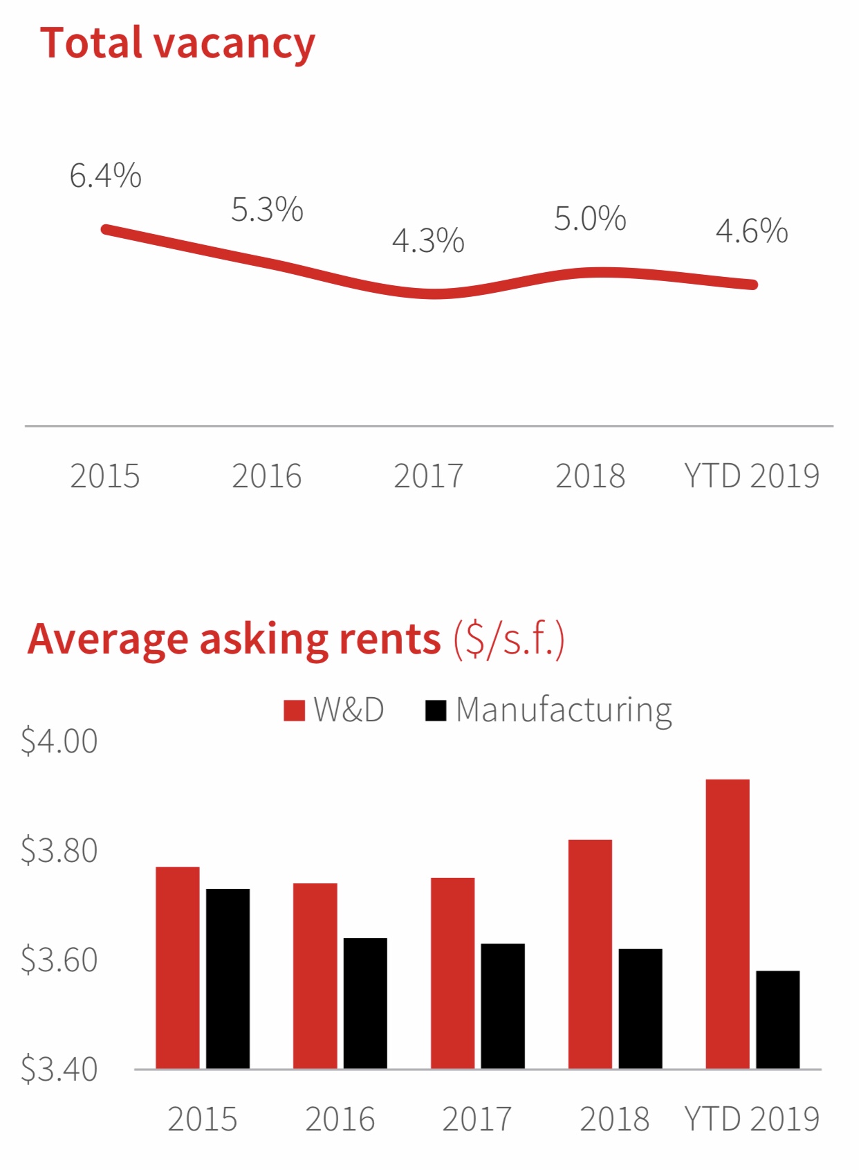 Q3, 2019 Columbus, Ohio Manufacturing / Warehouse and Distribution Average Commercial Real Estate Rents and Vacancy
