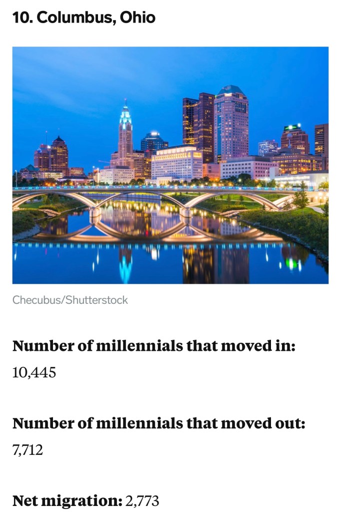 Columbus, Ohio ranked tenth on recently published list of U.S, cities where millennials are moving in, leaving classic big cities behind.