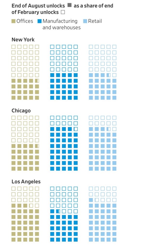 Chicago Office, Retail and Manufacturing compared to other U.S. metro areas. Who’s open and who’s not as of the end of August.
